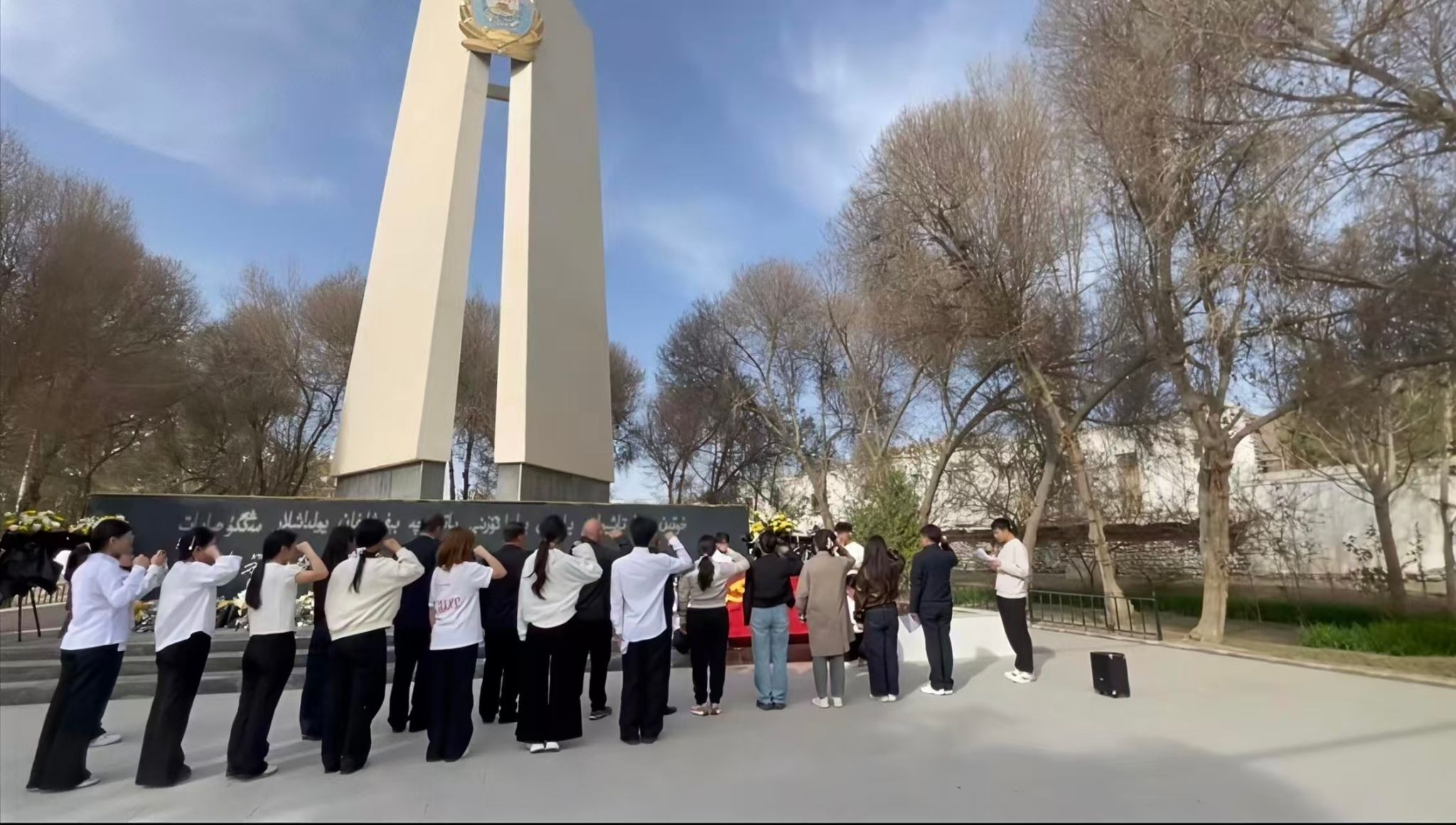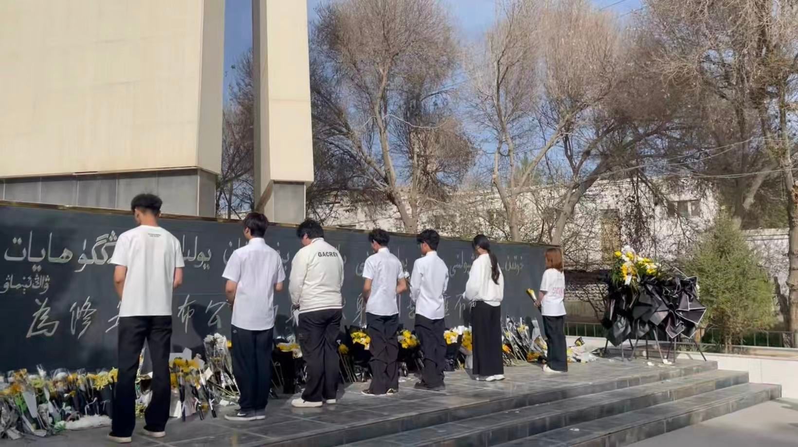 活动现场松柏掩映,纪念碑巍然矗立。全体人员整齐列队,神情庄重。活动伊始,学郭广星与党员代表一同缓步上前,向为修筑和布公路英勇献身的先烈敬献菊花。一朵朵饱含敬意与追思的菊花轻放于碑前,表达对革命先烈的深切缅怀与崇高敬意。